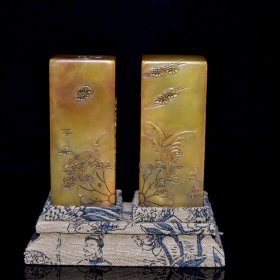 回流老货 寿山石田黄石摆件 原石原色雕刻 雕工精细 结晶体结构 血丝纹 萝卜丝纹明显可见 篆刻家【友竹】作 尺寸:3.3*3.3*11厘米(含底座高)净高8厘米 重量:485克