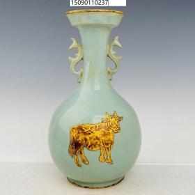 古董古玩老瓷器收藏 汝瓷奉华款瘦金体刻诗词像金双耳瓶28.5*15CM