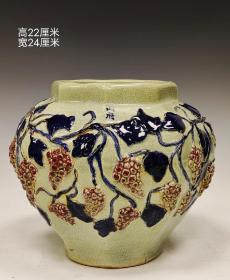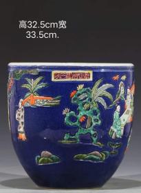 美品·识款“顺德博堂制古”精工细作满工蓝洒釉高浮雕瓷刻粉彩人物事故纹案头卷缸。.