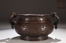 日本购回:古铜海浪纹鸟形耳一对(2)铜火钵或铜香炉上的装饰或底足,具体是什么购者自鉴,看包浆很老,清代或民国时期精黄铜制作,錾刻浮雕纹饰,做工精美。尺寸较大,包浆厚重,铜质坚实。