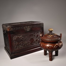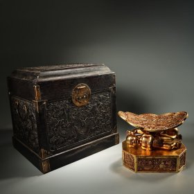 珍品旧藏收纯铜高浮雕錾刻鎏金童子龙凤枕头 工艺精湛 器型款式精 配黑檀木龙箱 箱子长30厘米 宽25厘米 高29厘米 重240克 高14.5厘米 长2厘米 宽13厘米 6400元 004540