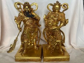 旧藏 大明永乐年施款 关公韦陀护法 精铜铸造,铜质精良,浮雕堑刻全鎏金,工艺精致,刀工细腻,金色厚重,包浆圆润。 尺寸:高90厘米,重一对90公斤