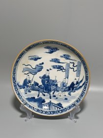 清代康熙青花麒麟送子瓷盘,直径22.6cm,高4.8cm。青花发色纯正,麒麟送子图案生动传神,人物形象栩栩如生,云纹飘逸优美。边框回纹装饰典雅,釉色洁白细腻。品相完好,适合收藏或家居摆件。