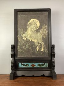 旧藏【麒麟祥云】楠木插屏,尺寸较大,麒麟图为碑刻拓片,底部彩绘双狮图案,双狮香炉图案手绘玻璃上,整体保存完整,品相尺寸如图!