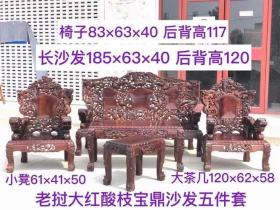 六七十年代年代上海土豪所用大红酸枝雕龙沙发五件套,土豪定做版,后背纯手工镂空雕刻九龙祥云图案,两侧麒麟送福,凤穿牡丹,雕刻精细,老虎腿,整料瑞狮扶手,精选上等大红酸枝芯料,份量十分沉重,独一无二的精品,全品相,包老保真,包浆一流 运费自理