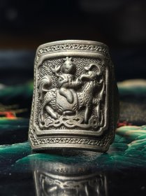 清末·老银麒麟送子雕花方牌戒指,仙姑生财有路(鹿)图案,人物开脸祥和,鹿在神话中是吉祥动物,常与仙界联系,鹿与禄、路谐音。品相极美,只有细微岁月磨损,传世包浆自然温润。圈口大小可调,适合各种手指尺寸,吉祥如意。实物拍摄,老银银含量低,喜欢的朋友可以入手,包邮不退换。 关键词:老银戒指扳指麒麟送子仙姑生财吉祥如意民俗杂项收藏把玩欣赏鉴赏艺术品古玩文玩银饰杂件盘玩老藏品老物件古玩少数民族指环戒子