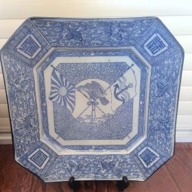 日本购回:日本明治时期(清末时期)老青花染付八边形大赏盘,深钵,大盘,直径31厘米,高6厘米。重3.5斤,中间有双旗帜和鹰隼图案,四周小开窗为麒麟云纹和*国万岁文字,高温柴烧老青花瓷非常老,正反面中间有老冲线,但叩击声音如磬很清脆,博物馆级别收藏品,历史价值大于实用价值,懂的拍。