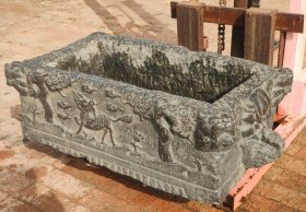 清中期,大户人家旧藏精品狮子头大石槽,黑青石,四面满工高浮雕,有祥云、麒麟、花鸟、有梅花、有鹿,图案寓意很好,纯手工雕刻,刻工精湛,栩栩如生,保存完整,无磕无碰,包老到代,极品包浆,放置庭院、茶室、会所摆设使用特好。长宽高深尺寸103cm/55cm/35cm/21cm[玫瑰][玫瑰]