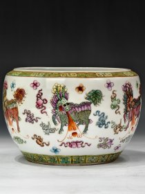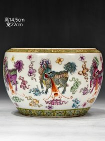 【麟吐玉书】粉彩满绘麟吐玉书纹案头卷缸。 图中卷缸通体软粉彩满绘麒麟纹,其画工精湛漂亮,绘画麒麟形象呈龙首、鹿身、狮尾,身体布满龙鳞,须毛飞扬,威风凛凛,口吐玉书,周身满绘八吉祥,整体层次丰富、图案繁密。 微观下,彩表氧化现象明显,墨彩氧化脱落痕迹自然明显,纯矿物料填彩,施彩堆垛,触摸有明显凹凸质感回馈皮肤,迎光下可见吃光现象,施彩处偶见老化开片,一眼开门。