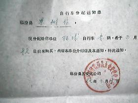 山西省临汾县五交化公司:1977年“环球牌”自行车分配通知单(果树场、农机局)