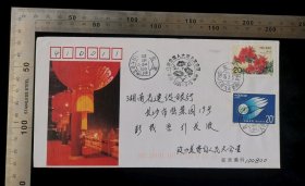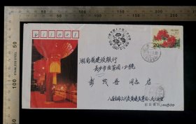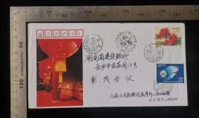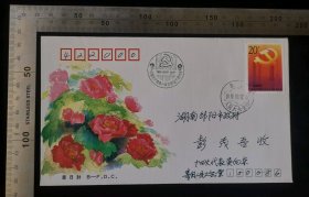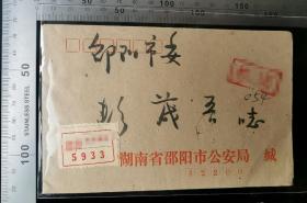 名人信札:湖南省邵阳市寄给邵阳书记彭茂吾实寄封,正盖邮资已付八角戳,正贴通信5933标签+加盖字样戳,邵阳-邵阳市委,单戳清晰,裸封无信扎,始发戳不清,gyx22205