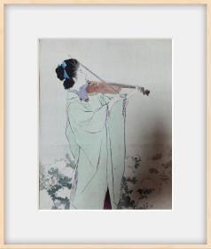 #木版口绘#镝木清方*《小提琴》*美人绘*保证明治时期原刻*浮世绘。明治三十九年《文艺俱乐部》口绘,套色技术精湛,品相完好,版画尺寸约29*22左右。