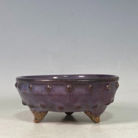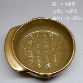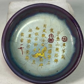 宋官窑钧瓷窑变釉.蚯蚓走泥纹刻字描金古钉笔洗摆件:此造型美观精致,庄重典雅高贵,手工制作,做工精美,胎质细腻光滑,老味十足,自然磨损,极其少有。值得收藏。尺寸6x14厘米、
