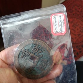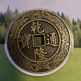 盒装大清镇库铜钱,纯黄铜材质,双龙古币刻花边雕母加厚乾隆通宝。直径7厘米,重154克。包浆自然,品相完好,保存极佳。边缘雕刻精美,龙纹清晰,字口工整。