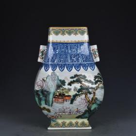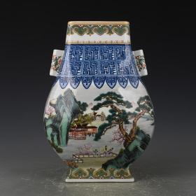 清乾隆粉彩山水人物纹贯耳瓶方瓶