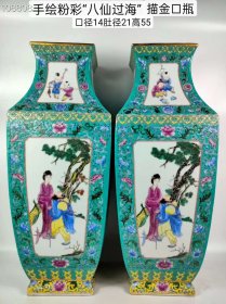手绘粉彩“八仙过海”人物故事纹描金口四方瓶