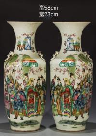 清乾隆青花粉彩人物故事纹贯耳瓶,高40.5厘米直径26厘米