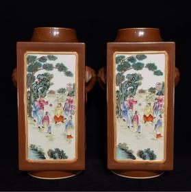 清乾隆酱釉粉彩人物故事纹象耳方瓶
