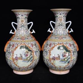 清乾隆粉彩人物图弦纹盘口瓶一对