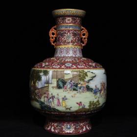 清乾隆胭脂红粉彩农家乐人物故事纹双耳盘口瓶