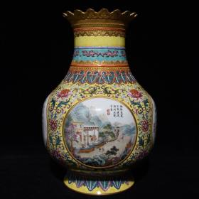 乾隆黄地开光粉彩鎏金山水人物纹花口瓶,高41直径26.5,