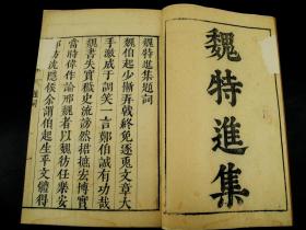 【重装加衬】清刻本《魏特进集》2册全。作者魏收人称“惊蛱蝶”。曾著《魏书》。为“北地三才子”之一。《书林清话》、《汲古阁校刻书目》等均有注录。首有娄东张溥序,集前均附有编者题辞,先列赋,次列文,后列诗。评述作家生平与创作;为研究中古文学的重要参考书,在学术界堪称影响广泛。