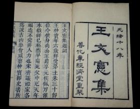 明汲古阁代张溥刻本,光绪翻刻《王文宪集》原装1册全。《书林清话》、《汲古阁校刻书目》等均有注录。首有娄东张溥序,集前均附有编者题辞,先列赋,次列文,后列诗。评述作家生平与创作;为研究中古文学的重要参考书,在学术界堪称影响广泛。