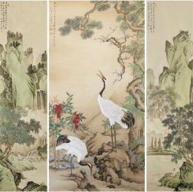 保真书画,王永旭,松鹤中堂 四尺整纸 (138*69cm)山水条屏 138*34cm*2有合影视频,支持定制 将“松鹤图”与“山水”结合,是中国传统绘画中常见的主题,既体现了自然之美,又蕴含吉祥寓意(松鹤象征长寿,山水象征天地永恒)