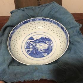 K-0103【精品存档】日本回流 明清陶瓷 莹手菓子钵 明末清初景德镇 青花玲珑大碗 底款:大清康熙年制 带日本藏家原木箱(碗口有一线3厘米),不用手电不宜看到)