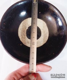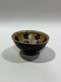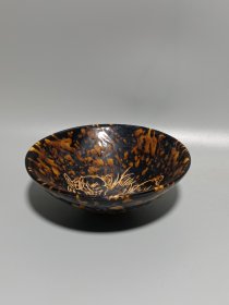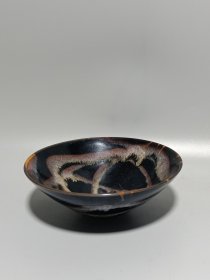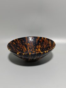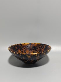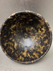 宋代吉州窑代瑁斑纹斗笠碗 黑釉底色,黄斑自然流淌,釉面光亮,斑纹流畅,斗笠形规整。碗身完整无磕碰修补,胎质干老,底部有自然老化痕迹,品相完好无修复。 尺寸:直径15cm,高5.7cm。 适合收藏把玩。