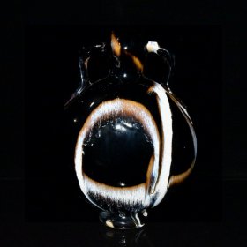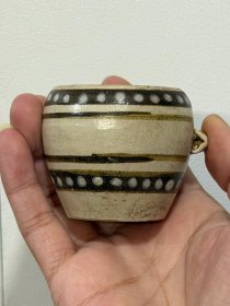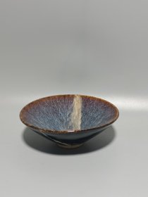 宋代吉州窑代瑁斑纹斗笠碗 黑釉底色,黄斑自然流淌,釉面光亮,斑纹流畅,斗笠形器型规整。碗身完整无磕碰修补,胎质干老,底部有自然老化痕迹,品相完好,无修复。 尺寸:直径15.2cm,高5.7cm。