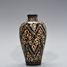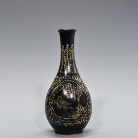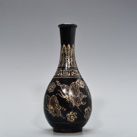 宋代吉州窑剪纸鸳鸯纹碗,口径15cm,高5.7cm。金口金边,釉面窑变,内壁剪纸鸳鸯纹,釉色层次丰富。整体成色还可以,有轻微磨损污渍。适合收藏或日常使用。