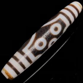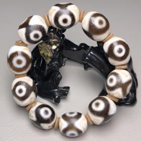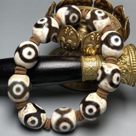 藏传古珠老料三眼天珠手链 尺寸约:20*18毫米*10颗 三眼天珠象征佛之身口意之圆满、三宝加护、速除外内密一切违缘障碍、、福禄寿、吉星拱照、障碍平息、财富不断,是密宗之财神。