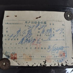 (泰古抽五)抗战陪都文化,《(重庆自来水股份有限公司)用户保证金收据(民国37年7月21日字第001841号》(户名朱公馆,地址金沙岗街43号。) 。。朱之洪(1871~1951),字叔痴,祖籍安徽省泾县,生于四川省巴县鹿角场(今重庆市巴南区南泉镇)。1903年,与杨庶堪等发起、组织资产阶级革命小团体“公强会”。同盟会重庆支部成立后负责宣传、联络工作。