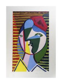 毕加索原版画 《条纹背景上的女性面孔》孙女玛利娜毕加索签名 对开石版画 限定414/500 立体主义名作 赠送艺术级装裱画框 附收藏证书