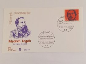 德国首日封 1970年恩格斯首日封 恩格斯像 贴德国邮票恩格斯诞辰150周年 年轻的恩格斯 带编号首日封07770 弗里德里希·恩格斯1820-1895德国思想家、哲学家、革命家、教育家、军事理论家,全世界无产阶级和劳动人民的伟大导师和领袖、马克思主义创始人之一。恩格斯是卡尔·马克思的挚友,被誉为"第二提琴手"他为卡尔·马克思从事学术研究提供经济支持。马克思逝世后,众望所归地成为国际工人运动的领袖