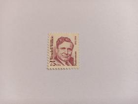 美国邮票 75C 1986 -1991年伟大的美国人 美国政治家 温德尔‧威尔基1892–1944年,美国政治活动家。在外交事务上采取合作态度,鼓吹"天下一家"的Yeah2国际合作思想,反对共和党内的孤立主义。1942年9月和10月受罗斯福之托历访非洲、中东、苏联和中国等地。在中国期间,曾建议宋美龄访问美国以获得援助。翌年将见闻写成《天下一家》,呼吁战后合作,甚有影响。