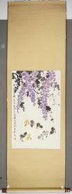 【同一上款:静波】著名书画家、曾任中国书协理事、陕西美协理事 王崇人 1988年国画《紫藤生辉》一幅(纸本立轴,画心约4.6平尺,钤印:崇人书画、其乐无极) HXTX386332