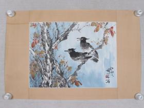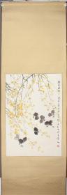 【同一上款:静波】著名书画家、曾任中国书协理事、陕西美协理事 王崇人 1988年国画《迎春雏嬉》一幅(纸本立轴,画心约4.9平尺,钤印:崇人书画、其乐无极) HXTX386333