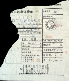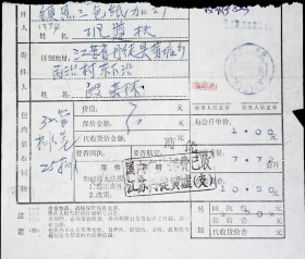 江苏丹徒寄山东桓台1992.10.22(1992.10.23)256407邮政包裹单剪片,国内包件邮费已付江苏丹徒黄墟支戳,商优戳