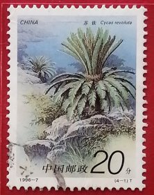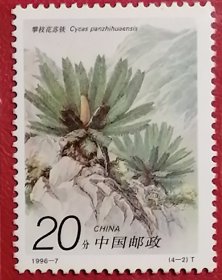 袁袁收藏中国邮票 1996-7 攀枝花苏铁 4-2 全新榆树地名戳 又名铁树,原产于中国、日本,树干高约2米,稀达8米或更高,叶、花、种子、根可作为中药材入药。通常生长在陡峭的石灰岩悬崖和海岸线的岩石上,其树姿优美,四季常青,为珍贵的观赏树种,2021年被收录入一级保护。花语为坚贞不屈、坚定不移、长寿富贵、吉祥如意。苏铁与中国的佛教文化紧密联系,福州市鼓山涌泉寺内五代时期栽植的苏铁古树,已历千年