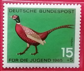 联邦德国邮票 西德 1965年 发行量577万 青少年福利附捐邮票 野生小动物 鸟类 雉鸡 4-2 九品新票 野鸡,山鸡。善奔跑,特别是在灌丛中奔走极快,也善于藏匿。飞行速度较快,也很有力,但一般飞行不持久。在中国,自古就被视为“吉祥鸟”,在中国明清瓷器中,无论筒瓶、棒槌瓶、花觚还是将军罐上,雉鸡和牡丹都经常被画在一起,寓意着吉祥和富贵。
