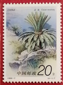 袁袁收藏 中国邮票 1996-7 苏铁 4-1 全新 又名铁树,原产于中国、日本,树干高约2米,稀达8米或更高,叶、花、种子、根可作为中药材入药。通常生长在陡峭的石灰岩悬崖和海岸线的岩石上,其树姿优美,四季常青,为珍贵的观赏树种,2021年被收录入一级保护。花语为坚贞不屈、坚定不移、长寿富贵、吉祥如意。苏铁与中国的佛教文化紧密联系,福州市鼓山涌泉寺内五代时期栽植的苏铁古树,已历千年