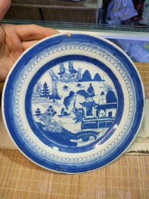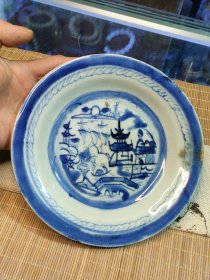 清代青花山水亭台楼阁青花盘,品相尺寸看图片视频,有小磕,有冲线,大尺寸21公分,青花发色漂亮,手绘画工精美,包老保真,值得收藏。