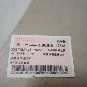火车票 杭州→石家庄北 上铺 2002.9.14.