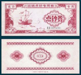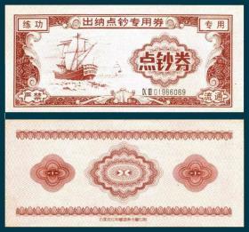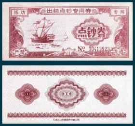 帆船图练功券 石家庄印直线形底纹右ⅨⅡ蓝序码红色仿1元