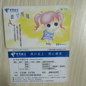 中国电信广西201电话卡(血型情缘A型10元)1张