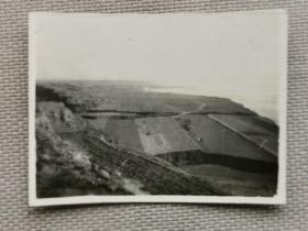 民国1939年(昭和14年)2月 《日军在山西省太原市 运城 临汾 曲沃 解县 潞安 系列79:日军在运城永济的长旺村 右边是黄河》黑白老照片一张!尺寸:长5.1厘米×宽4.3厘米。