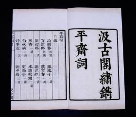 民国影印汲古阁本【宋六十名家词——平斋词】原装1册全,纸张洁白如雪,柔韧结实。明末著名藏书家、文学家、汲古阁创始人毛晋编,《宋六十名家词》为宋词总集,是公认的缮写最精良、校勘最佳、流传最广的词集,唯此书300年来一直为学者传诵,是研究词学的重要丛书。南宋词人洪咨夔正直敢言,常有讽刺官吏、讥刺朝政之作,《平斋词》词风激壮、磊落、爽致。展现了他的铮铮傲骨与为国忧患。书后有毛晋题跋。