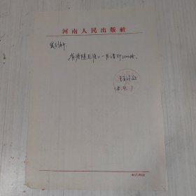 《有涯随无涯》一书付印函一页。河南人民出版社。
